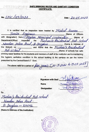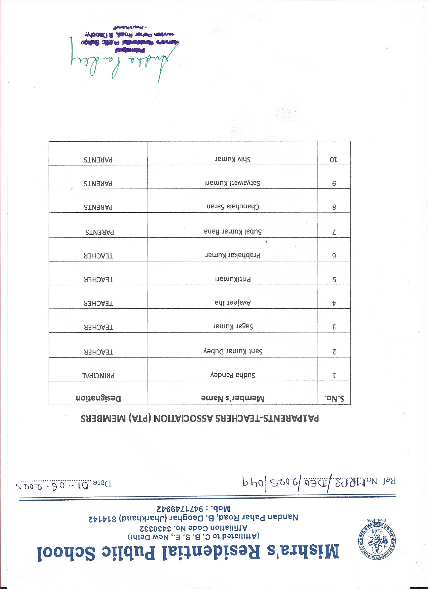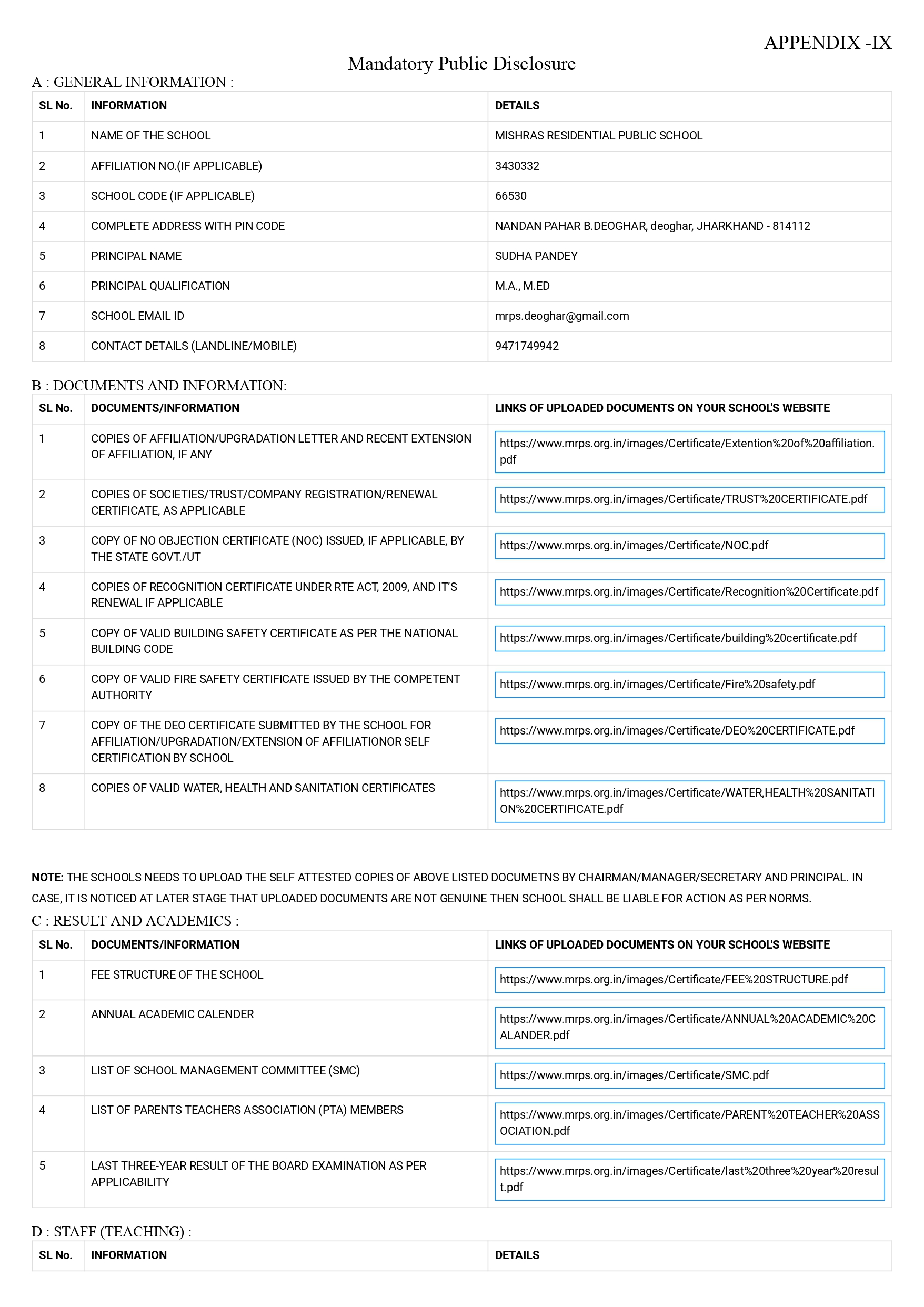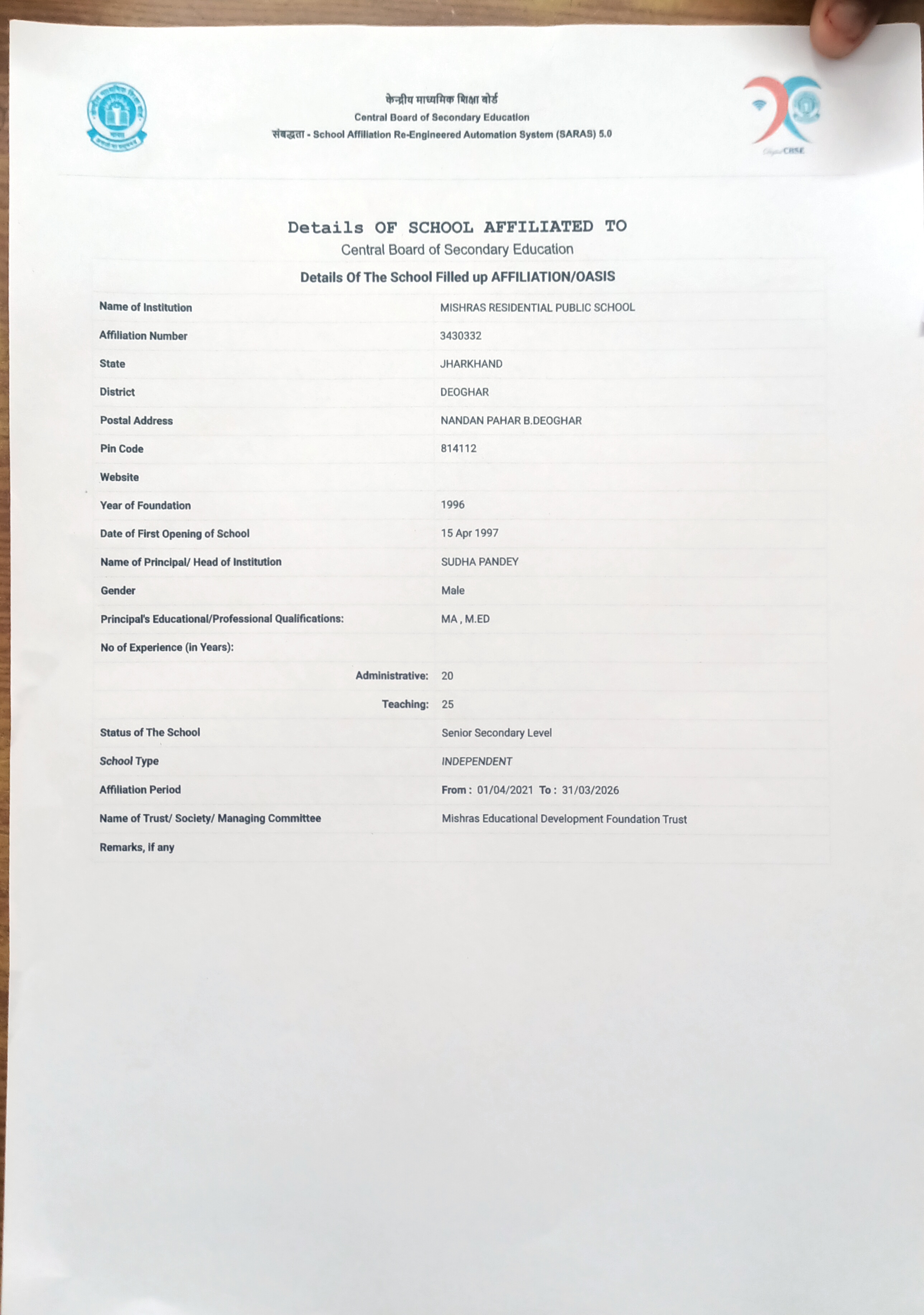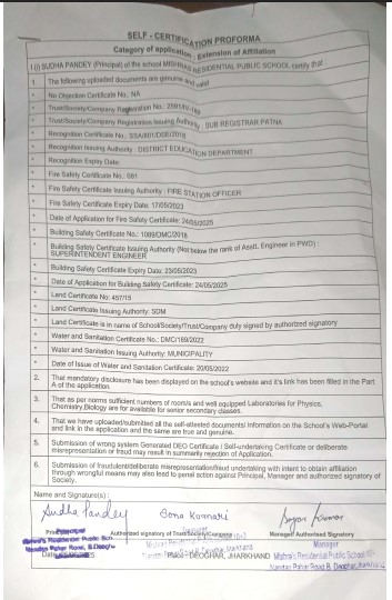 CBSE Certificate Of Mishra's Residential Public School, 10+2
